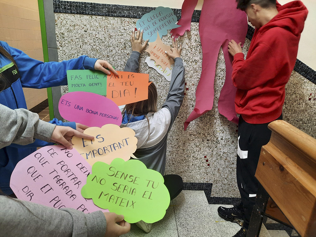 A continuació es va iniciar la segona fase del projecte, centrada en la creació artística. El punt de partida va ser una pluja d’idees sobre diferents problemàtiques que els preocupen com a adolescents, i van sortir temàtiques com els trastorns mentals i alimentaris, la manca d’autoestima, les addiccions, els estereotips, les discriminacions per gènere o origen... En relació amb aquestes temàtiques, cada grup havia de projectar una instal·lació per ubicar en un lloc concret de l’escola. La premissa per a la creació d’aquestes instal·lacions és que havien de ser obres que fessin reflexionar sobre algunes de les problemàtiques comentades i que tinguessin com a objectiu tenir cura d’un mateix i dels altres, en relació amb el concepte de cura i auto-cura treballat a les anteriors sessions. Així mateix, totes les instal·lacions havien de ser obres que interpel·lessin a l’espectador, que el fessin reflexionar i que remoguessin consciències.
