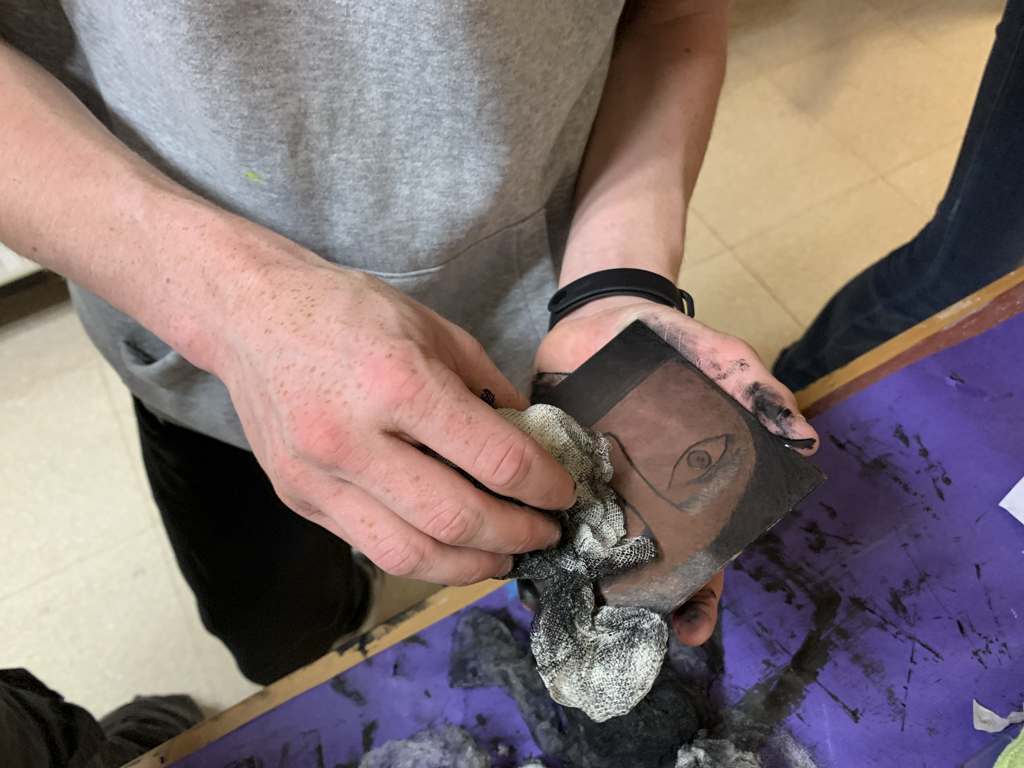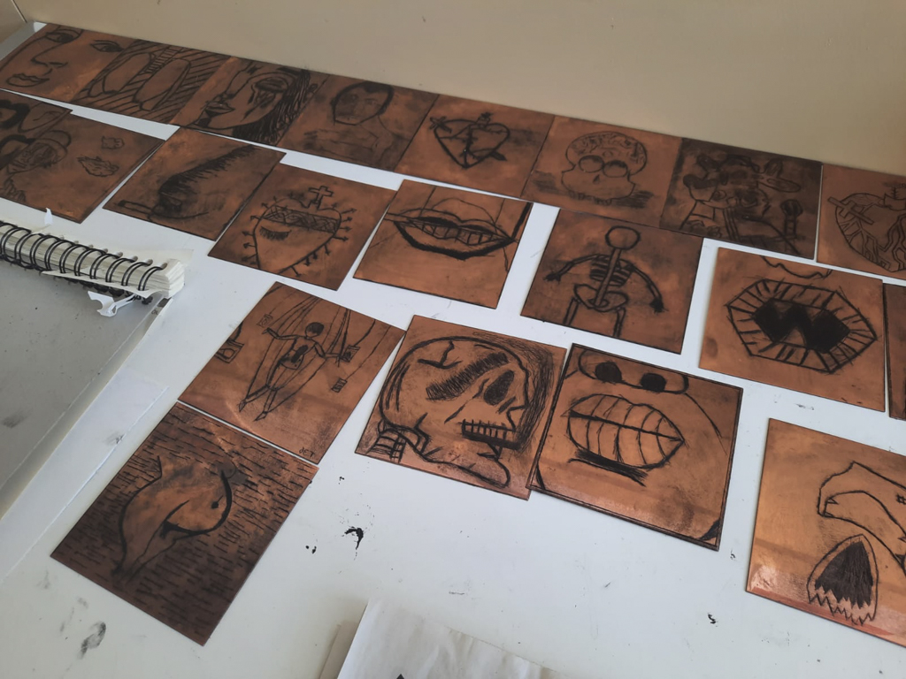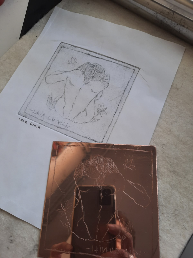Aquesta recerca personal i col·lectiva ens portà a treballar una tècnica d’expressió individualment on la cura intervé en tot el procés de treball: el gravat (punta seca, ...). Tenir cura del treball que fem, com el fem, com manipulem les eines, com dibuixem, com i què comuniquem...