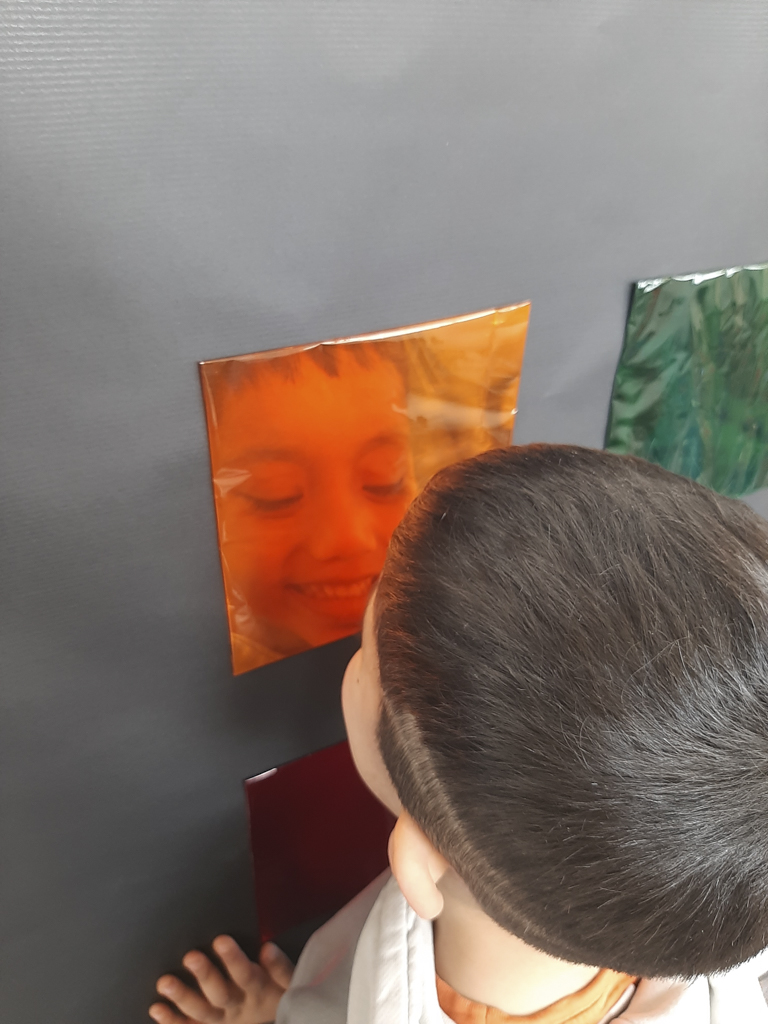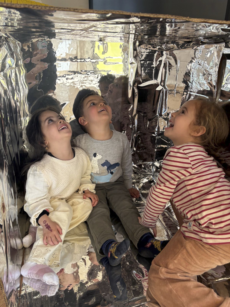 Provoquem amb els miralls la distorsió de la imatge. Segons si els miralls són plans, còncaus, convexes, augmentatius, dins un prisma, un cub… ens mirem buscant en la transformació i deformació a nosaltres mateixos, ens veiem cinc cops, o tres, o quatre, allargats, amples, deformats…, això ha provocat veure’s de maneres inesperades i riure’s de les pròpies imatges. Busquem i manipulem, joc amb simetries, creacions geomètriques, compartim mons i històries, despertem el goig per crear, transformar, manipular, generar sorpresa, misteri i estupefacció; en resum, provocar.